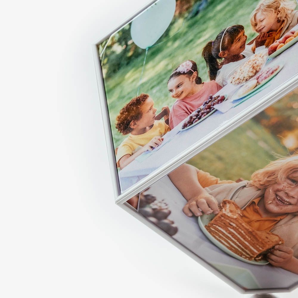 O Cubo Giratório com Fotos é composto por uma estrutura em acrílico, destacando-se pela sua forma original de exibir as tuas fotografias mais especiais.